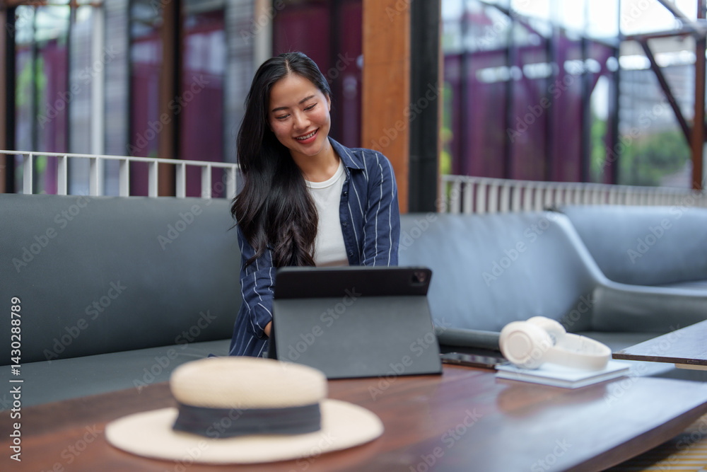 Young asian woman using tablet in coworking space, enjoying remote work with headphones and hat on the table, representing modern work lifestyle