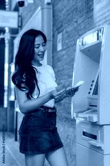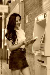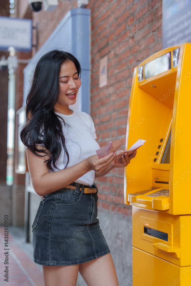 Happy young woman counting cash just withdrawn from a bright yellow automated teller machine in an outdoor city setting, radiating joy while managing her finances