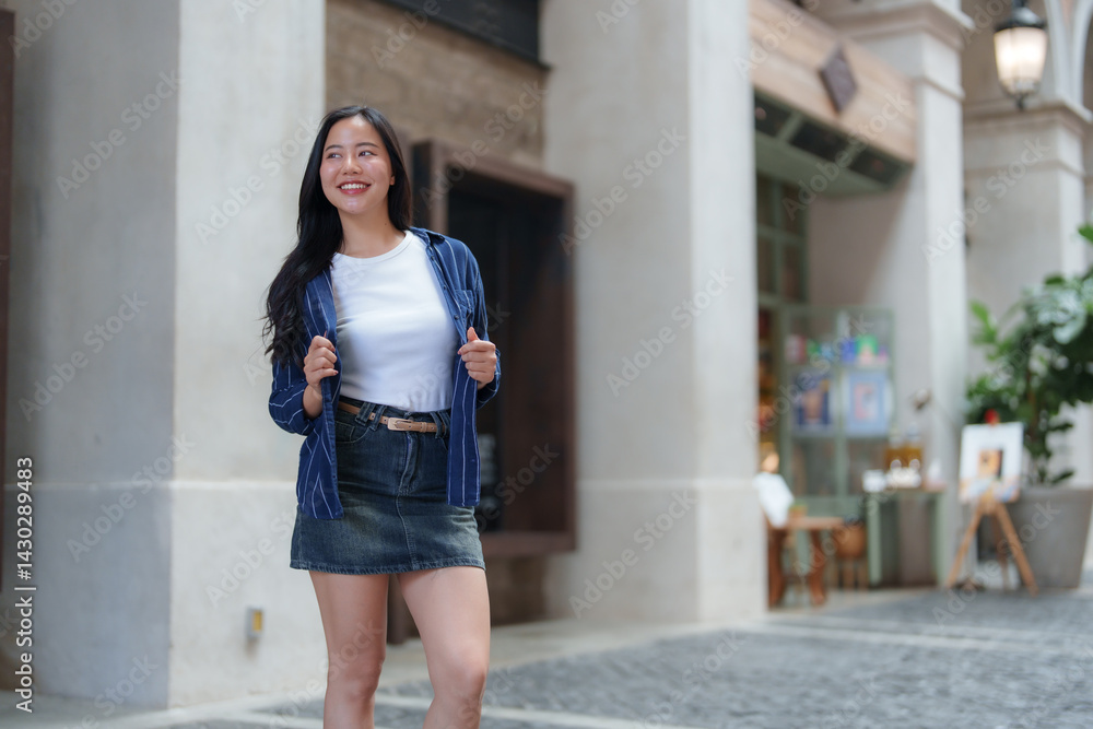 Fashionable young asian woman walks in a shopping mall gallery, wearing a denim skirt and a blue and white striped overshirt, smiling and looking away