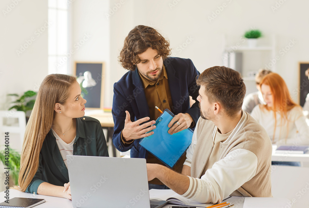 Group of young college students and classmates sitting at desk in the classroom and talking with male friendly teacher looking at the laptop monitor screen. Education and study concept.