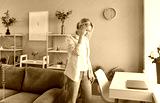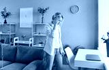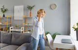 Tired woman experiences headache or migraine at home, dealing with dizziness and health problem, feeling sick with pain in a challenging setting with focus on rest and recovery daily.