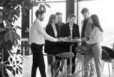 Coworkers working together in an office during a group meeting, engaging in conversation and reviewing documents as a team. People teamwork, collaboration, and professional interaction.