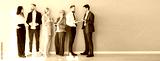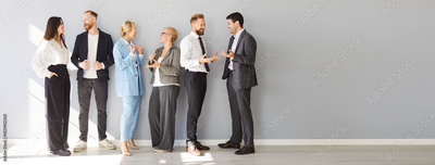 Group of business professionals standing near gray wall in office engaged in lively conversation. Team of colleagues exchanging ideas and collaborating in friendly and productive atmosphere. Banner.