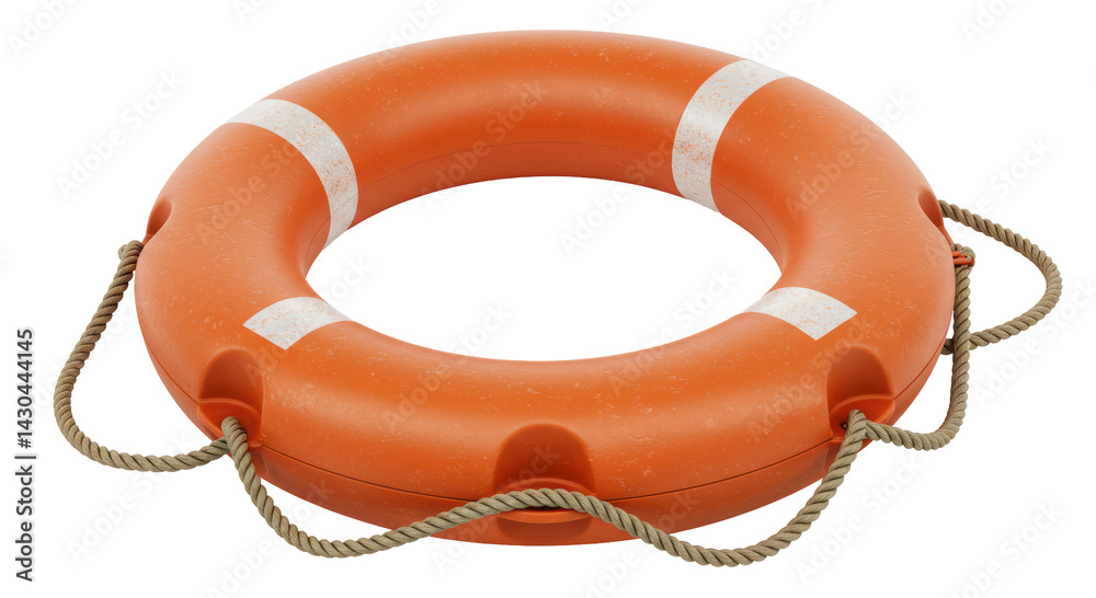 Isolated Orange Lifebuoy with White Stripes and Rope Detailing