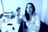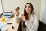 Attractive girl painting her nails while sitting at the laptop computer and drying her nails. Woman in the domestic clothes doing her nails with a nails polish at the table. Lady blowing on her nails