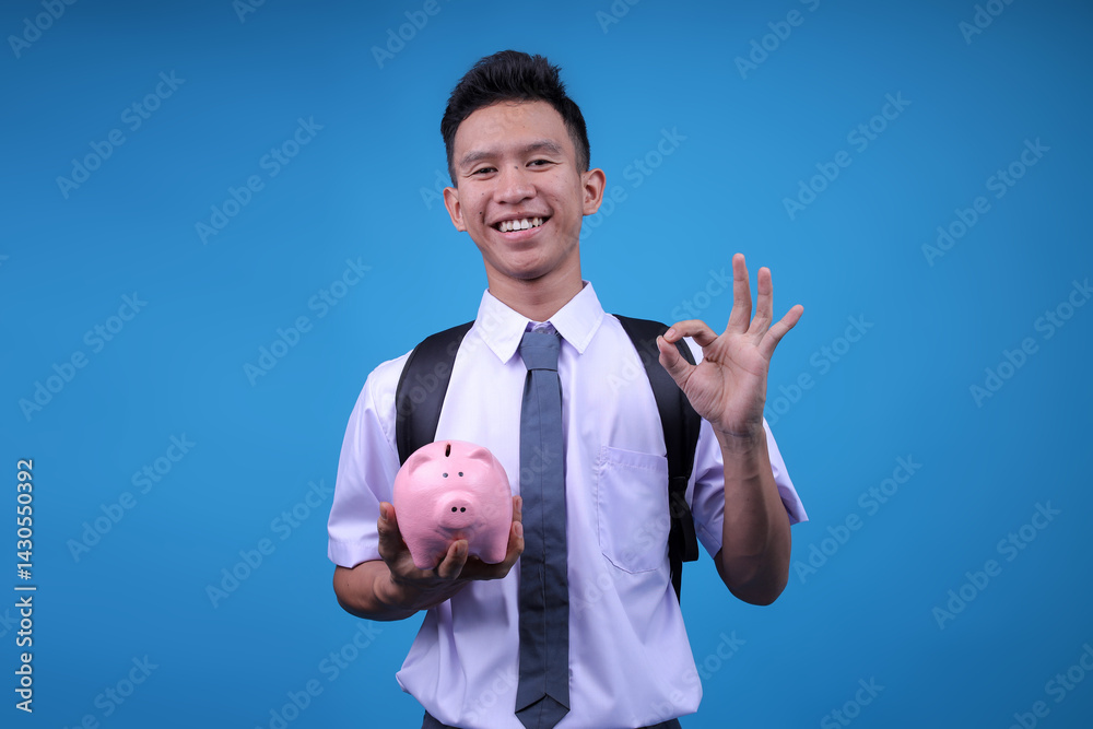 Attractive Indonesian High School Student Showing OK Sign And Holding Piggy Bank