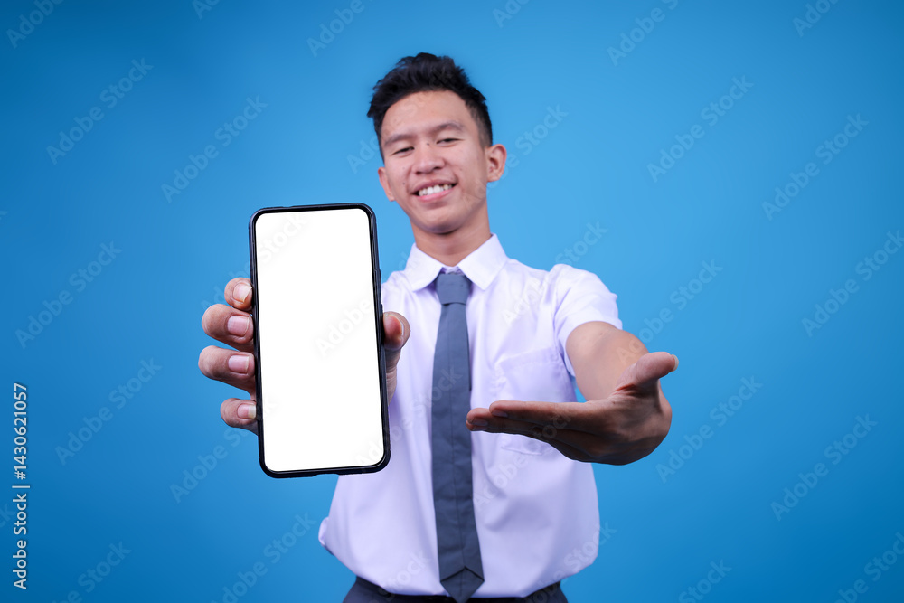 Smiling Young Asian Student Male Showing Mobile Phone For Mockup While Presenting