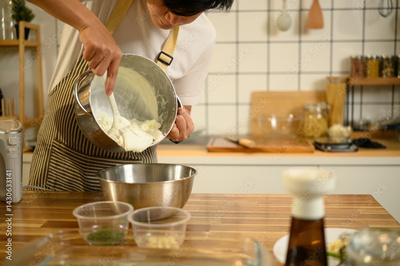 Smiling asian man wearing an apron preparing whipped cream in cozy kitchen