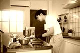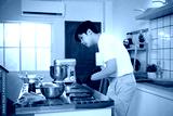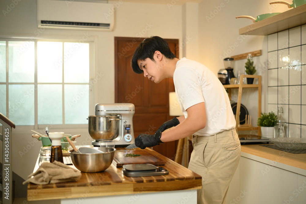 Man wearing black gloves chopping herbs on a wooden cutting board