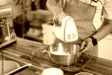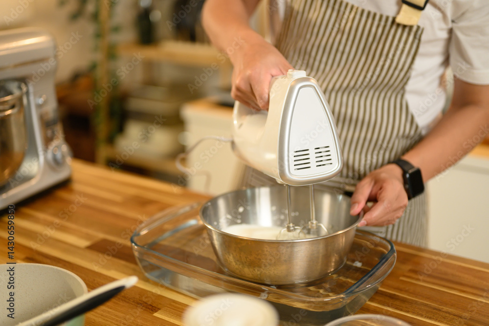 Close up of man using handheld electric mixer to whip cream in a stainless steel bowl