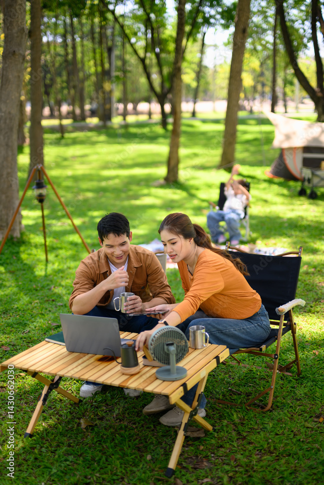 Happy couple enjoying hot drinks at a campsite while child plays in the background