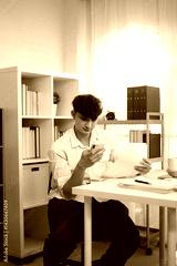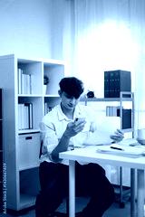Smiling man freelancer in a white shirt checks his smartphone at home office desk