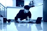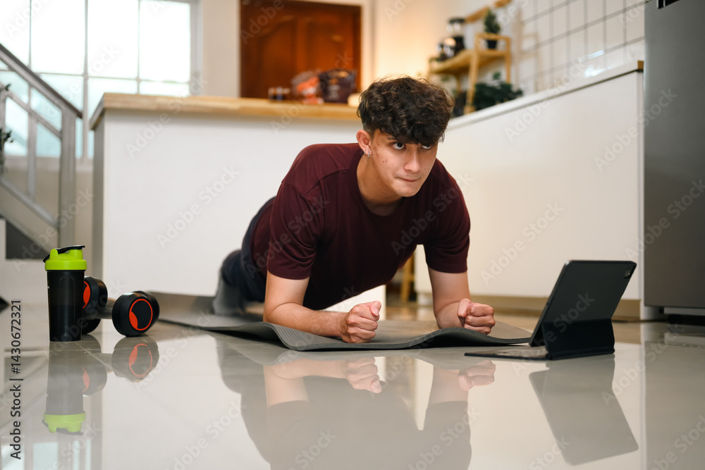 Young man doing a plank exercise on mat while watching a fitness video on digital tablet
