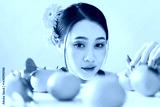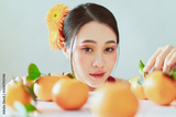 Young woman with vibrant makeup and flowers surrounded by oranges in a bright setting
