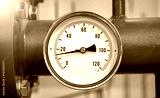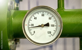 Mechanical pressure sensor on pipeline. Pressure gauge on green pipe. Minimum pressure inside pipeline. Flowmeter on industrial chemical equipment. Sensor for measuring load on pipe.