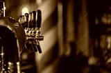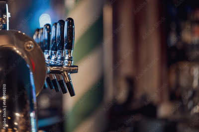 Close-up of shiny beer taps with chrome and black handles in a bar, featuring a blurred background. Inviting atmosphere, ideal for pubs or beer-related themes.