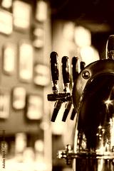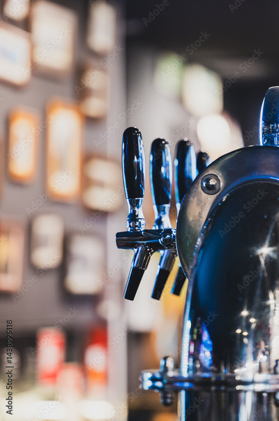 A close-up of shiny beer taps with multiple handles in a cozy bar. The blurred background features framed pictures and warm lighting, creating an inviting pub ambiance.