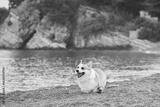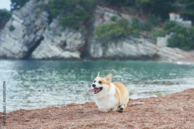 A Corgi lies on the beach near the water, with a background of rocky cliffs and the sea. The scene highlights the tranquility of a coastal retreat.