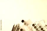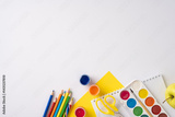 Colorful school supplies arranged on a white desk, including pencils, paints, and scissors