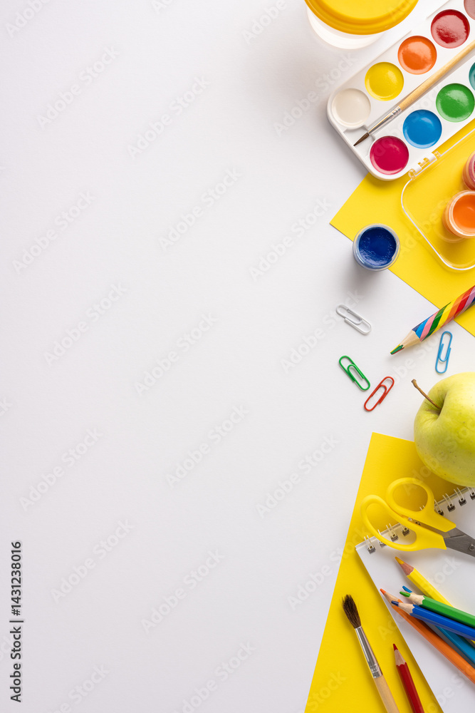 Colorful school vertical supplies arranged neatly on a white background evoke creativity and learning