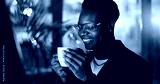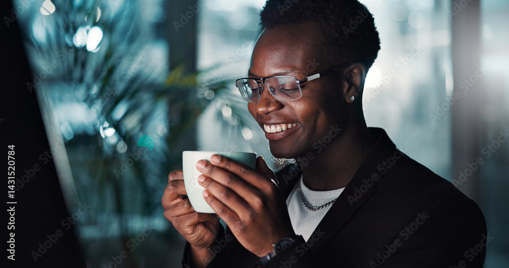Business, black man and coffee in office at night for caffeine drink, work break and project deadline. Male person, smile and relax with espresso beverage for problem solving, solution and overtime