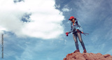 Woman Traveler with Backpack hiking in Mountains with beautiful summer landscape on background mountaineering sport lifestyle concept