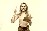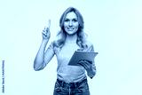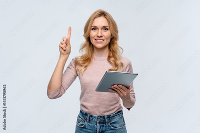 Smiling caucasian young middle age woman freelancer manager using digital tablet, having idea, pointing upwards on copy space surfing on social media, mobile applications, e-learning isolated in white