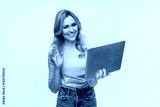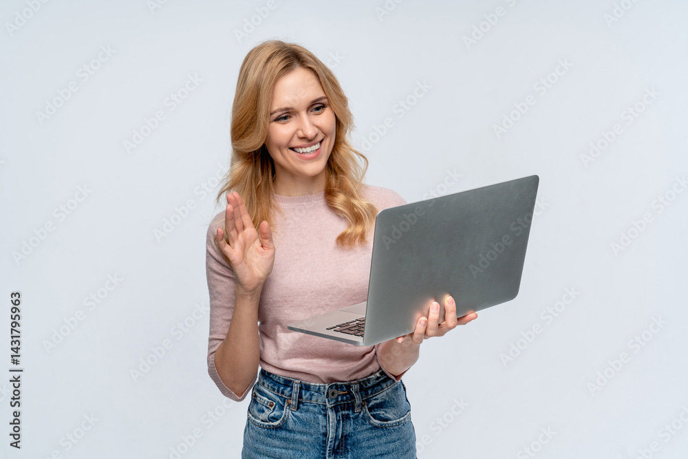 Happy Caucasian woman holding using laptop looking at computer screen make conference online call, smiling lady female user waving hand doing internet video chat isolated on white studio background