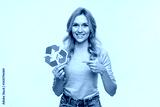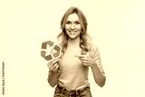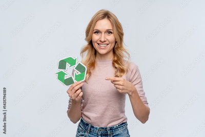 Young caucasian woman eco-activist pointing holding recycling logo sign for sorting garbage paper plastic, environmental conservation saving planet from contamination, renewable energy sources