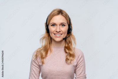 Young friendly caucasian woman IT support customer support agent hotline helpline worker in headset looking at camera while assisting customer client isolated in white background