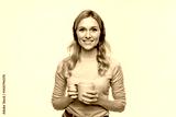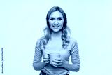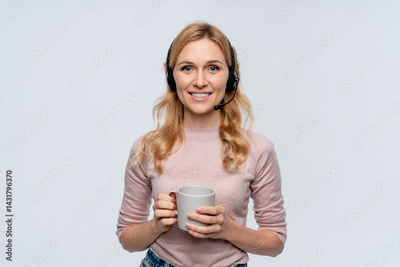 Young business woman telephone operator hotline worker customer support service manager with headset hold cup of coffee isolated on a white background copy space. Call center concept
