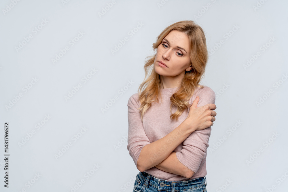 Upset confused bad emotional and thinking Caucasian woman. Unhappy stressed female. Young lady standing feeling depressed dramatic scene looking at camera on isolated background.