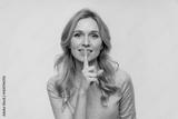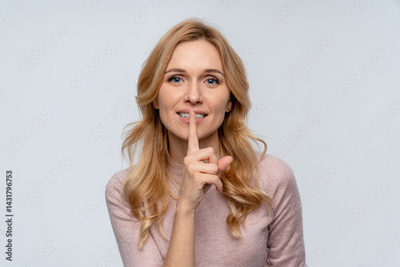 Smiling positive business woman female manager holding finger on lips mouth keep it quiet secret information showing hush shh shush gesture isolated on white studio background
