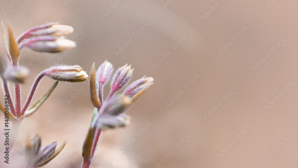 Close up view of Hairy bird’s beak flower buds in the early spring time with copy space.