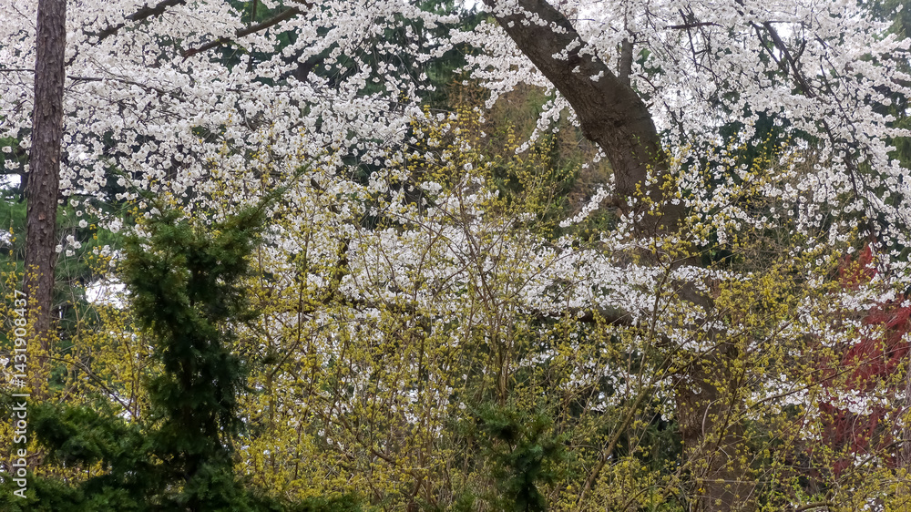 Close up view of colorful spring time bloom on tall trees in Michigan.
