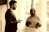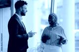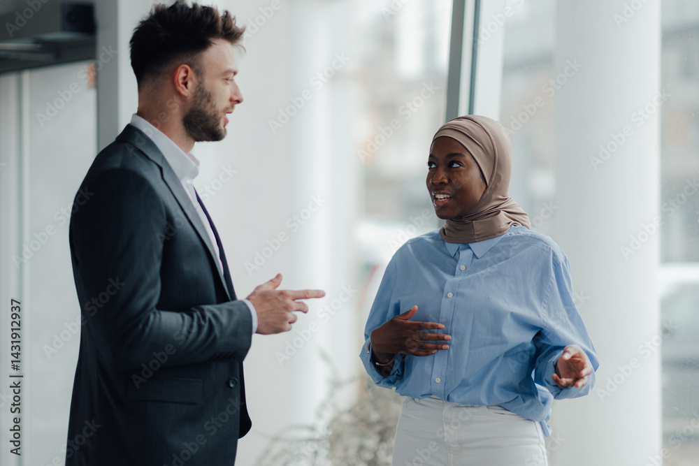 Businessman and businesswoman talking near window in office