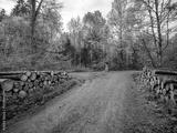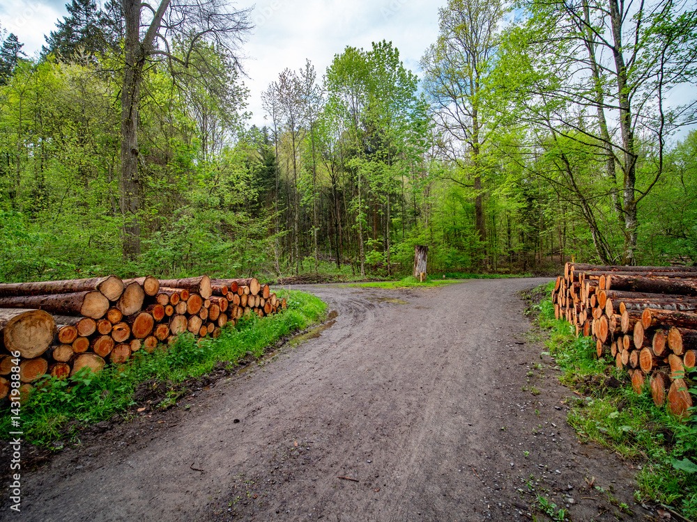 Markierte und abholbereite Baumstämme im Mischwald im Frühjahr