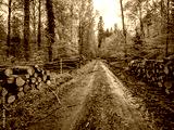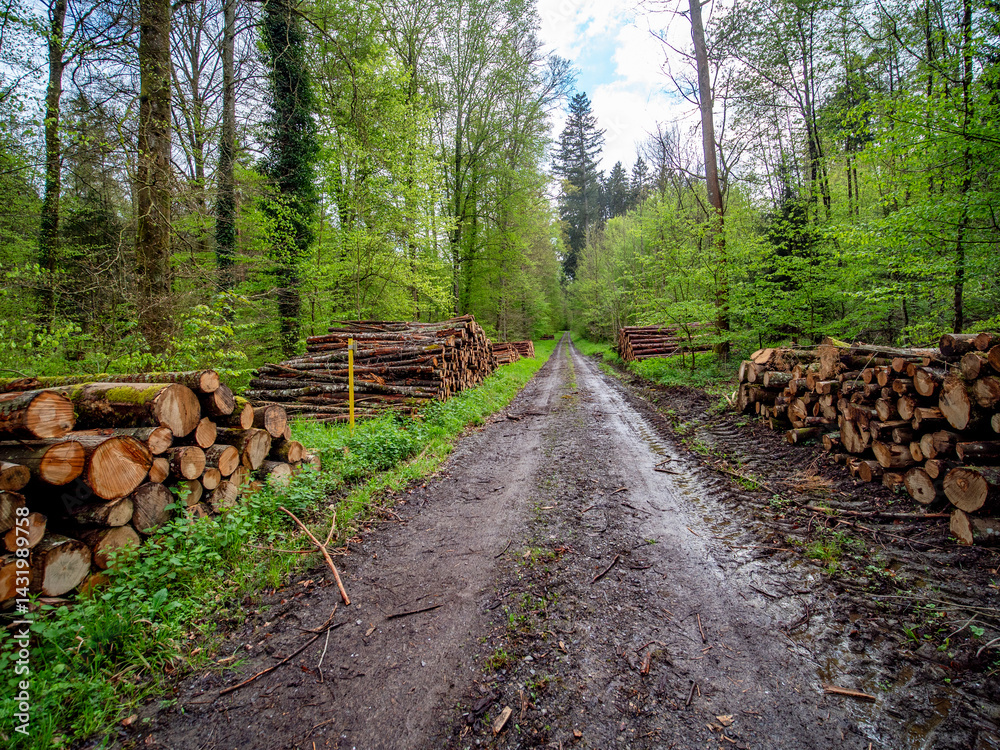 Markierte und abholbereite Baumstämme im Mischwald im Frühjahr