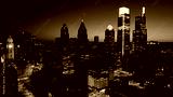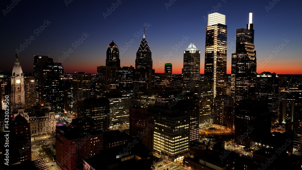 Sunset Skyline In Downtown Philadelphia At Philadelphia In Pennsylvania United States. Highrise Buildings Landscape. Colorful Sunset. Philadelphia At Pennsylvania United States.