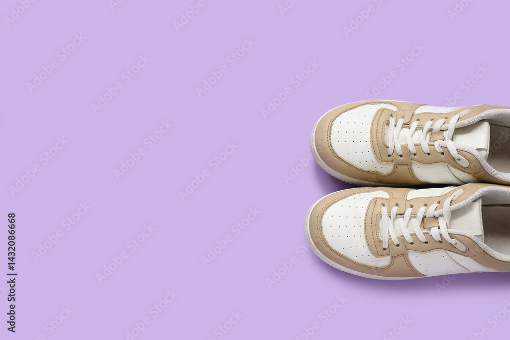 Stylish sneakers on purple background