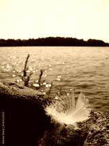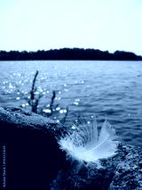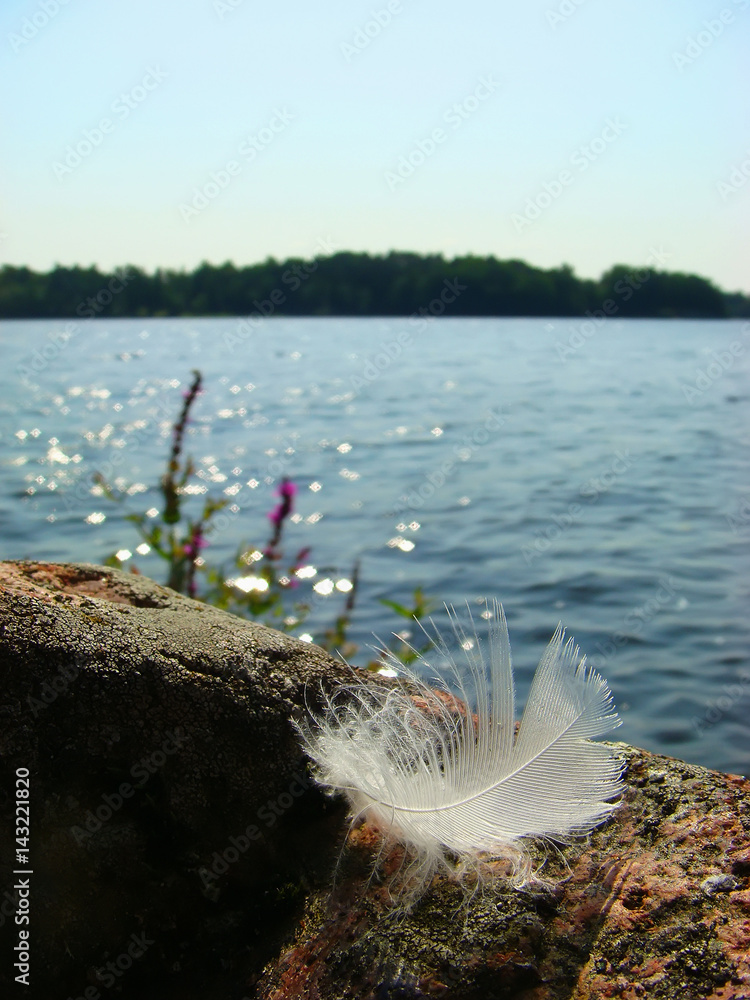 White light on a rock close-up against the blue lake. Concept of contrast. For modern background