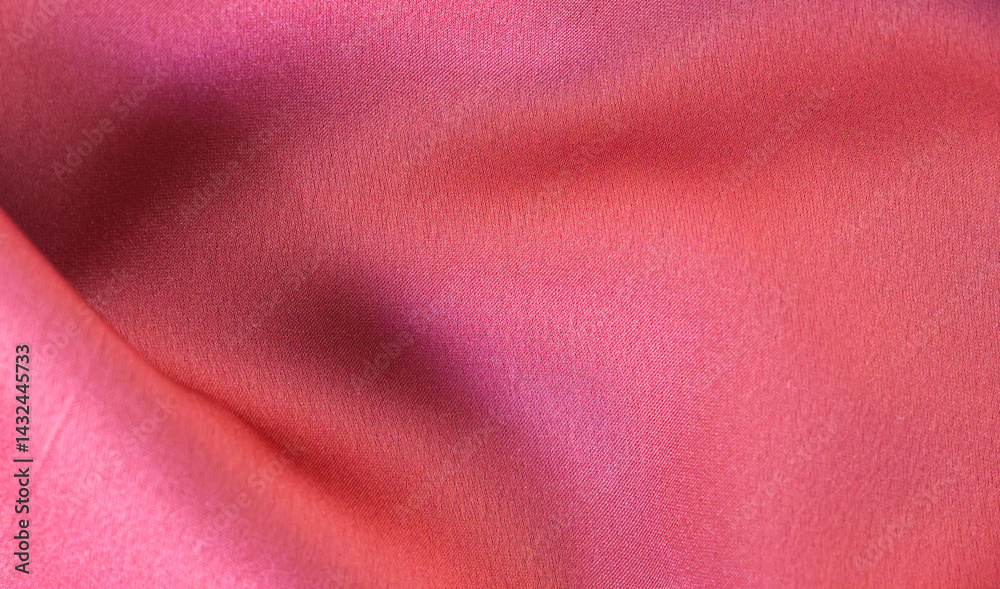 Viva Magenta toned red magenta fabric atlas. Close up pink silk satin texture for sewing. Abstract background wallpaper. Twisted folds cloth.