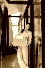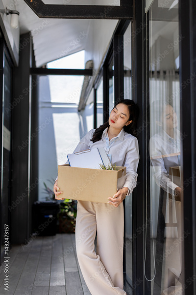 Business woman with box cardboard packing personal items after losing jobs. asian business woman standing on office background. Your fired Unemployed Jobless People Crisis