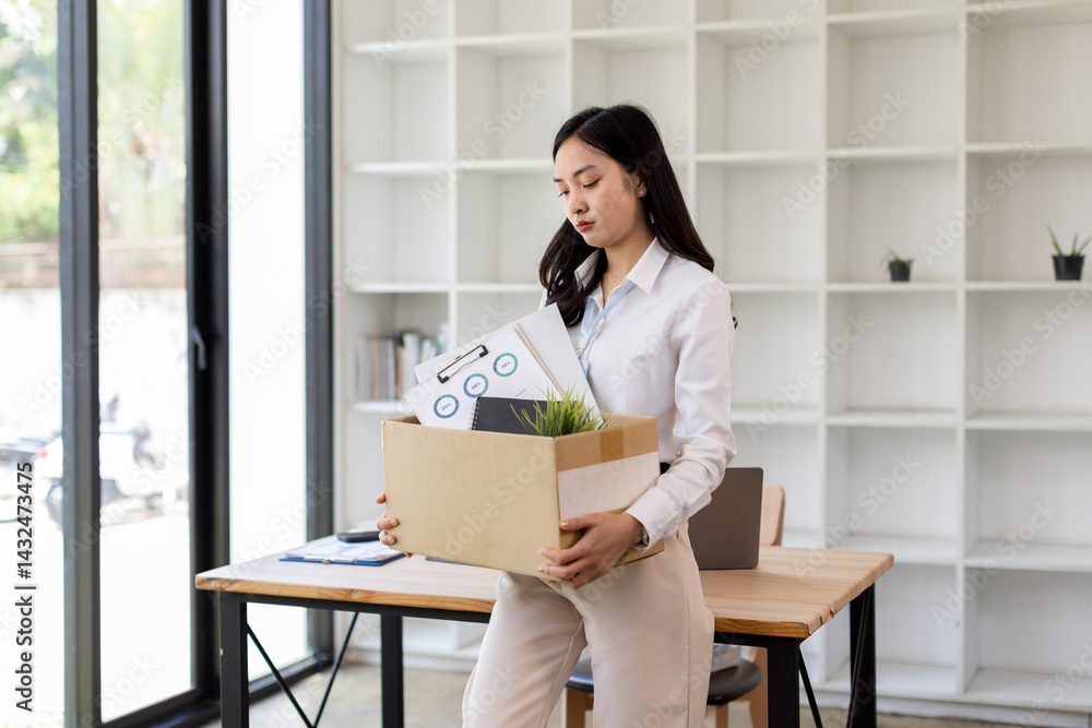 Business woman with box cardboard packing personal items after losing jobs. asian business woman standing on office background. Your fired Unemployed Jobless People Crisis