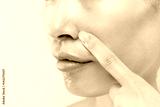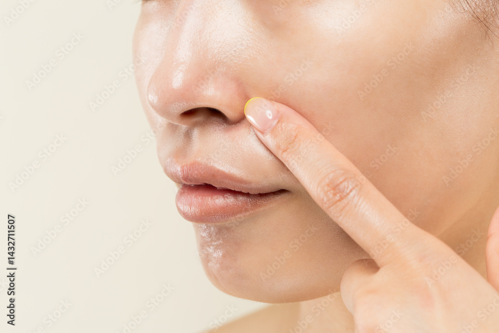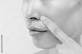 鼻を指差す若いアジア人女性の顔のクローズアップ.