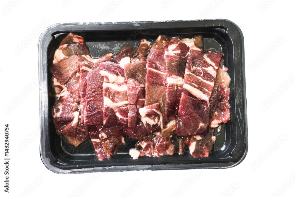 Fresh Raw Beef Cuts in Black Plastic Tray Isolated on transparent background png file, healthy food, advertising photography