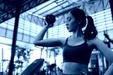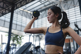 Young athletic woman is working out with dumbbells, performing biceps exercises in a modern fitness center, focused on her strength training routine