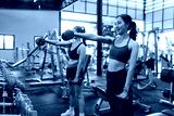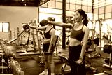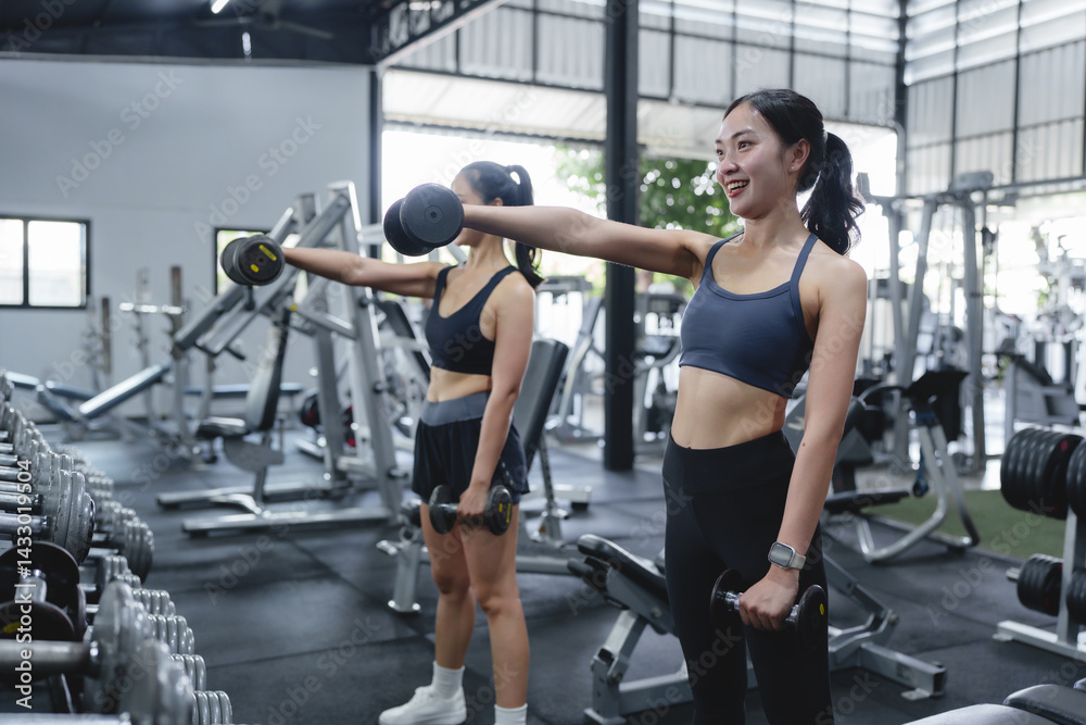 Two athletic women performing lateral raises with dumbbells, strengthening their shoulder muscles as part of their fitness routine in a modern gym environment