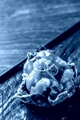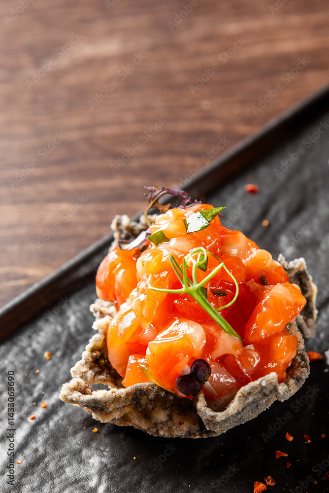A gourmet dish featuring delicate diced seafood served atop a crispy black shell, garnished with fresh herbs and a drizzle of sauce, elegantly presented on a black plate.