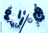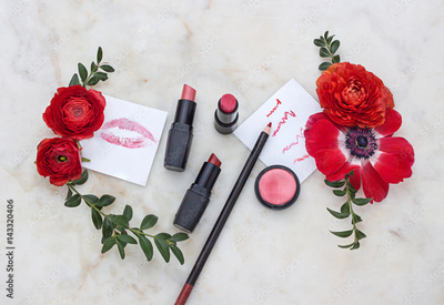 Beauty flat lay with decorative cosmetics and red flowers on the marble background. Top view
